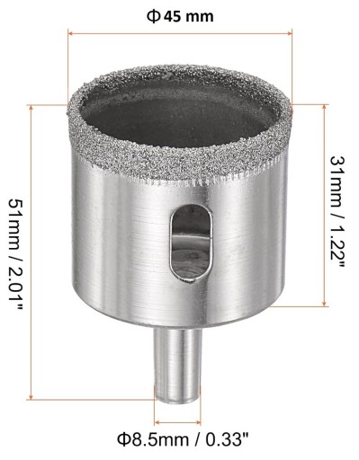 - ✔️ Doskonała precyzja: Otwornica o średnicy 45 mm zapewnia precyzyjne wiercenie otworów w gresie, ceramice oraz innych twardych materiałach.