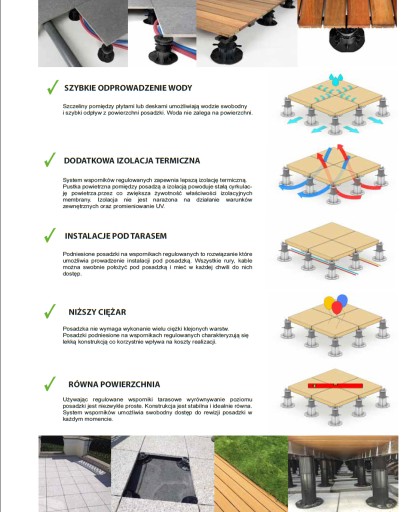 Zaleca się użycie również w przypadku możliwej wulkanizacji warstw (papy, izolacje płynne itp.) Gumowe podkłady pod wsporniki dodatkowo wygłuszają całość konstrukcji tarasu.
