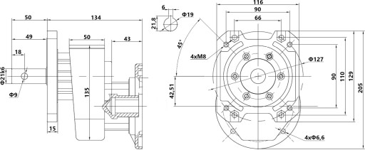Dedykowany do redukowania napędu silników elektrycznych MS 80 z kołnierzem mocującym (B5) oraz wałkiem napędowym Φ19 mm.