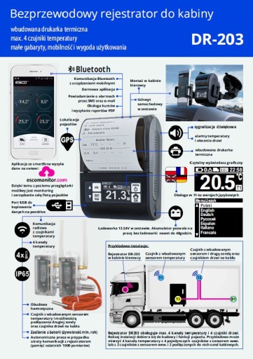 Rejestrator DR203 jest mały, poręczny z ergonomiczną obudową i dostępem do bezprzewodowego termometru. Zasilany jest z wbudowanego akumulatora, który pozwala na pracę bez ładowarki do 48 godzin. Dzięki tej technice pomiarowej i ruchomej w pomieszczeniach ruchowych. Do czasu dołączony jest uchwyt samochodowy z ładowem i ładowarką.