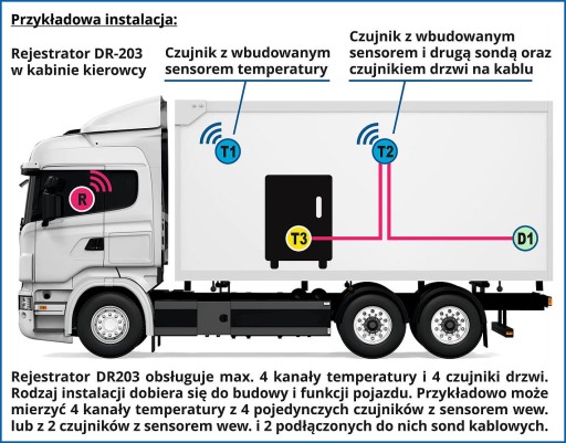 Na tej aukcji proponujemy państwu gotowy i kompletny zestaw składający się z rejestratora z drukarką dr203 oraz 2 czujnik1 bezprzewodowy i przewodowy dołączony do bezprzewodowego. Nie ma więc potrzeby przeciągania kabli z kabiny kierowcy do chłodni.