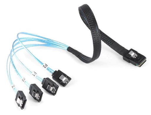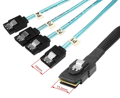 Nowy kabel mini-SAS SFF-8087 - 4x SATA 7pin. Pozwala podłączyć 4 dodatkowe dyski twarde z gniazdem SATA do kontrolera z gniazdem mini-SAS SFF-8087 36PIN. Kabel zapewnia wysoką przepustowość wynoszącą aż do 6 Gb/s.