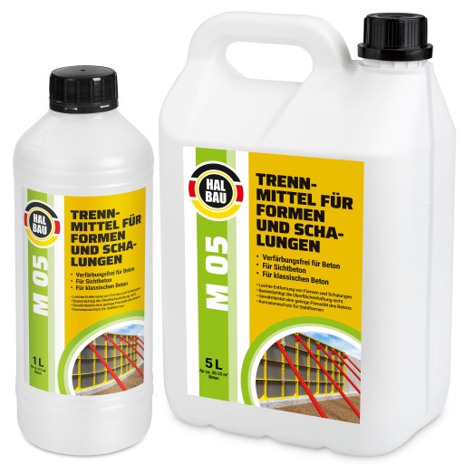 TRENNMITTEL FÜR FORMEN UND SCHALUNGEN HALBAU M05 jest to profesjonalny najwyższej jakości, ekologiczny preparat antyadhezyjny produkowany na bazie nowoczesnych mikronizowanych wosków o niskiej lepkości. TRENNMITTEL FÜR FORMEN UND SCHALUNGEN HALBAU M05 umożliwia bardzo przyjazne dla środowiska wytwarzanie wszelkiego rodzaju elementów betonowych o jednorodnej, bardzo gładkiej pozbawionej powierzchniowych porów powierzchni i ostrych krawędziach. Beton nie ulega przebarwieniom oraz uszkodzeniom podczas rozformowywania. Preparat antyadhezyjny HALBAU M05 nie pogarsza przyczepności powierzchni do dalszych prac budowlanych.