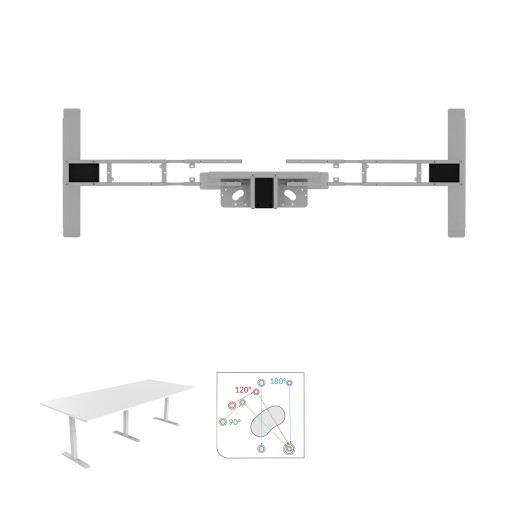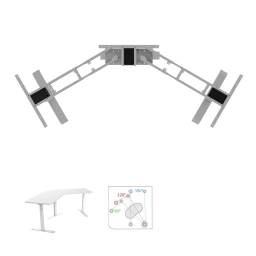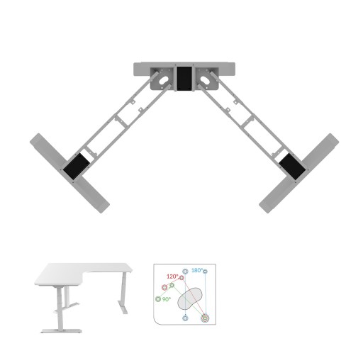 Wszechstronna rama elektrycznego stelaża oprócz regulacji góra/dół oraz przekształcenia do trzech wariantów, pozwala na podwójną ręczną regulację horyzontalną (w bok). W łatwy sposób rozszerzysz konstrukcję pod wymiar swojego blatu. Sugerowane wymiary blatu: dla 90° 1300 - 1900 mm (2 strony), 600 - 800 mm; dla 120° 1100 - 1800 mm, 600 - 800 mm; dla 180° 1700 - 2900 mm, 600 - 1000 mm.