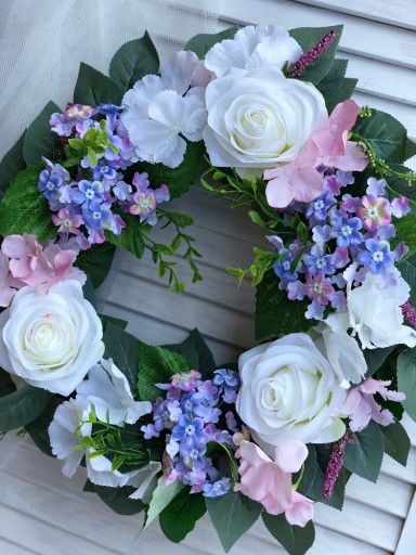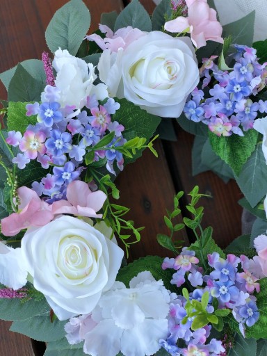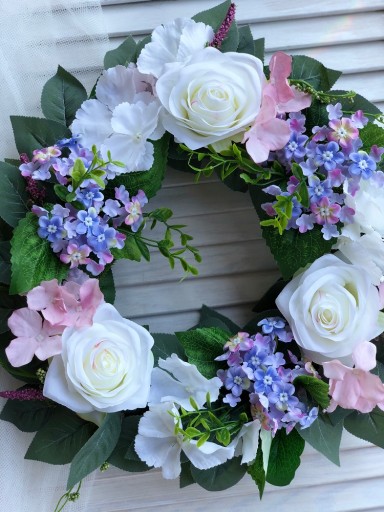 Wianek ozdobiony sztucznymi kwiatami róż, hortensji, kaliny oraz liśćmi i różnorodnymi dodatkami.