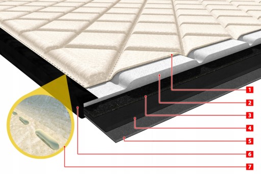 - Pianka poliuretanowa (10mm) o zwiększonej elastyczności, zapobiega ubytkom sztywności podczas użytkowania oraz zapewnia przepuszczalność powietrza dzięki otwarto-porowatej strukturze komórkowej.