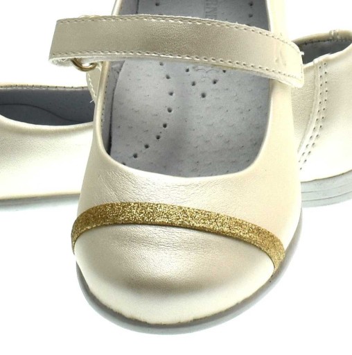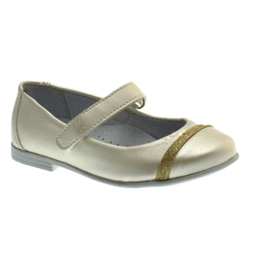 Perłowe balerinki dziewczęce ze złotą lamówką z przodu. Skórzane wnętrze i wkładka to niewątpliwe atuty.