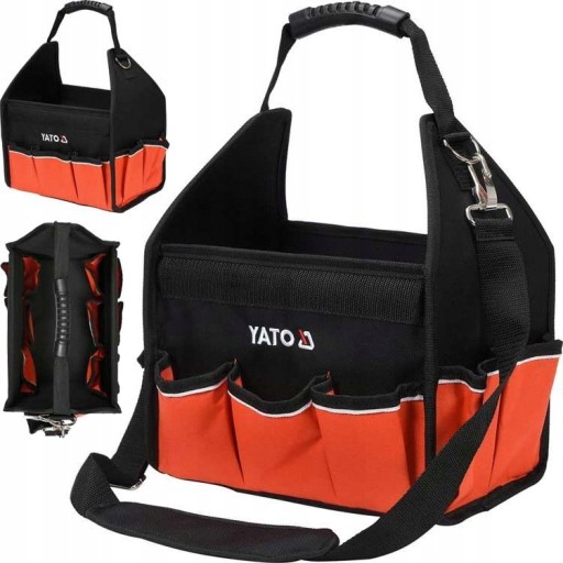 Otwarty pojemnik narzędziowy, wykonany z technicznego poliestru 600D, przeznaczony do przenoszenia elektronarzędzi, narzędzi ręcznych i osprzętu bezpośrednio na stanowisko robocze.