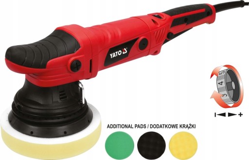 Profesjonalna polerka mimośrodowa marki YATO, wyposażona w regulację obrotów i system podtrzymania mocy na niskich obrotach, także przy mocnym docisku maszyny.