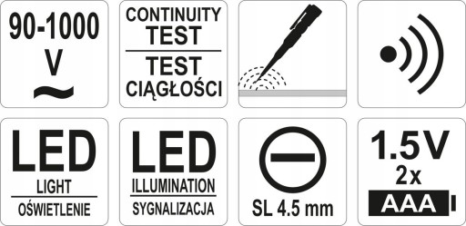 Działając na zasadzie indukcji, bezdotykowo wskazuje czy przewody są pod napięciem. Wykryte w przewodach napięcie sygnalizuje za pomocą diody LED i sygnału dźwiękowego. Eliminacja bezpośredniego kontaktu grotu z odizolowanym przewodem zwiększa bezpieczeństwo użytkowania, przyspiesza także pracę.