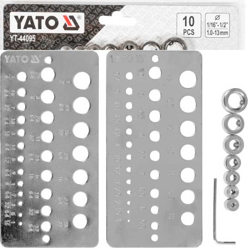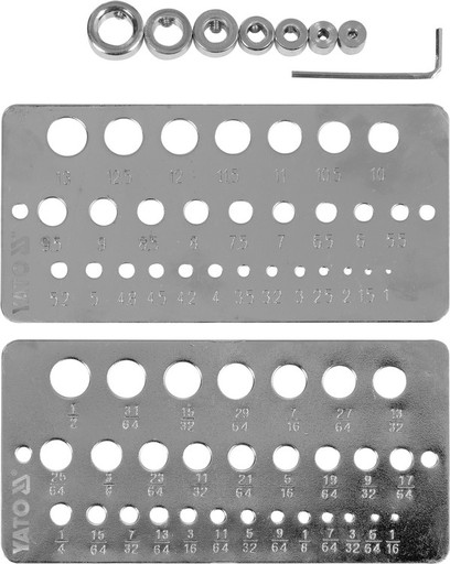 Zestaw marki YATO złożony z dwóch stalowych płytek z otworami do kontroli średnic oraz ograniczników głębokości wiercenia.