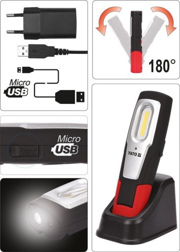Akumulatorowa lampa warsztatowa Yato ze światłem głównym 600lm oraz latarką 120lm.