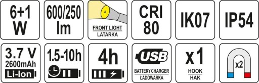 LAMPA WARSZTATOWA 6W COB, 600LM + 250LM, LI-ION 3.7V 2600MAH, IK07, IP54, CRI80