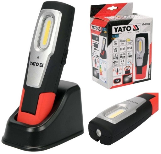 Akumulatorowa lampa warsztatowa Yato ze światłem głównym 600lm oraz latarką 120lm.