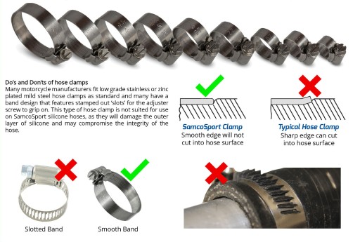 Opaski do 20 mm średnicy mają 10 mm szerokości, a o średnicy 22 mm i większe mają 13 mm szerokości. Opaski te mają gładką, zaokrągloną, walcowaną krawędź wewnętrzną, co sprawia, że idealnie pasują do przewodów silikonowych Samco Sport.