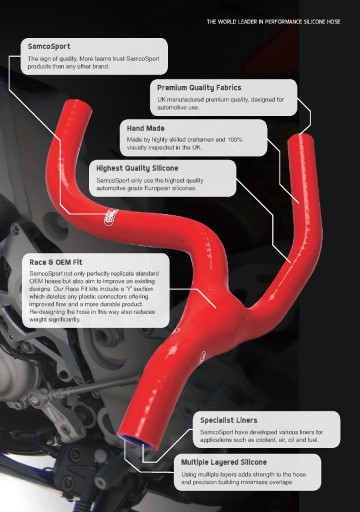 Węże motocyklowe Samco Sport oferują dłuższą żywotność i niezwykłą trwałość w wysokiej temperaturze i przy wysokim ciśnieniu, przydatne zwłaszcza w mocno wysilonych silnikach. Są używane przez wiele najlepszych zespołów Superbike, w tym zespół Colchester Kawasaki BSB, World Superbike BMW i inne światowej klasy zespoły.