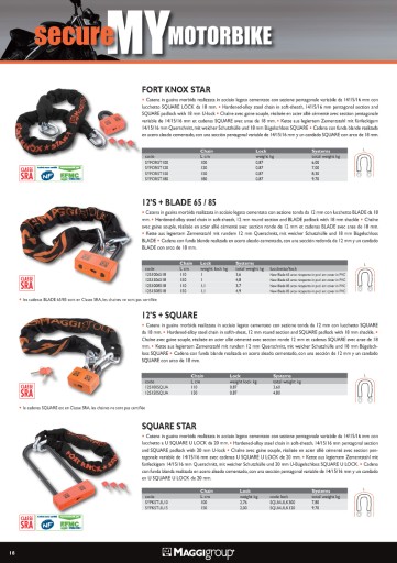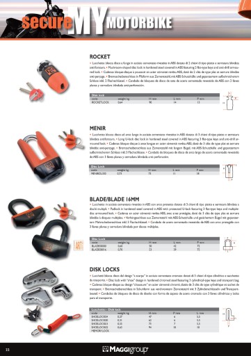 Zabezpieczenia przed kradzieżą motocykli, skuterów i rowerów produkowane przez MAGGI zapewniają wysoki poziom bezpieczeństwa. Projektowane we Włoszech, produkowane zgodnie z ISO 9001, uzyskują certyfikaty TÜV, SRA, NF.