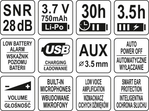 Praca w nausznikach z wyłączonym modułem gwarantuje obniżenie poziomu hałasu o 28 dB.