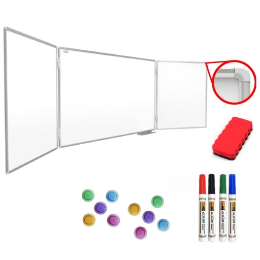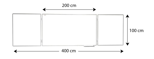 Powierzchnia tablicy (tablica główna + 2 dwustronne, uchylne skrzydła) wykonana jest z wysokiej jakości stali lakierowanej na biało. Staranne pokrycie powierzchni specjalnym lakierem zapewnia odpowiedni kontrast i zabezpiecza ją przed wnikaniem tuszu z markerów w jej głąb. Pozwala to na łatwe usuwanie notatek bez pozostawiania smug.