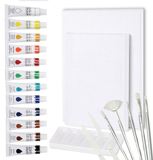 ✅ W zestawie upominkowym znajdziesz wszystko co niezbędne do stworzenia własnego obrazu - dwa rozmiary płócien, zestaw farb akrylowych, pędzle malarskie, paletkę i szpachelki.