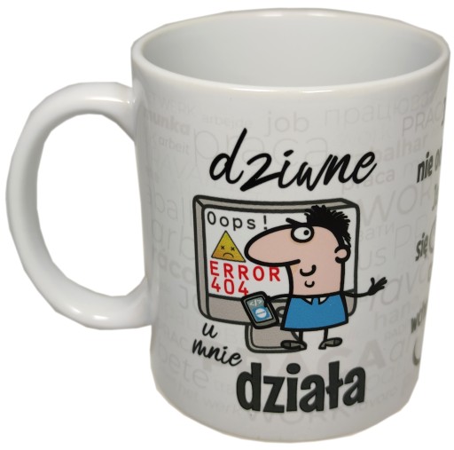 Na kubku znajduje się zabawna grafika z popularnym motywem w środowisku informatyków: