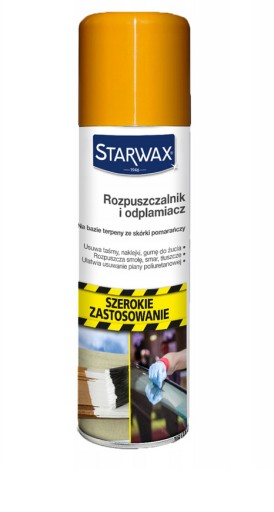 Starwax Rozpuszczalnik i odplamiacz to wielofunkcyjny środek o szerokim spektrum funkcji. Formuła oparta o wyciąg z naturalnej skórki pomarańczy brazylijskiej wykazuje szczególną skuteczność w rozpuszczaniu klejów, dzięki czemu preparat jest niezastąpiony przy usuwaniu wszelkich pozostałości naklejek i zabrudzeń klejami. Rozpuszcza gumę do żucia. Doskonale sprawdza się w usuwaniu tłustych zabrudzeń ze smoły, olejów, pasty do obuwia, starych naklejek czy smoły. Środek całkowicie ulega biodegradacji.