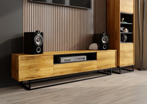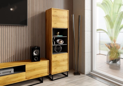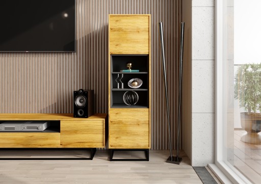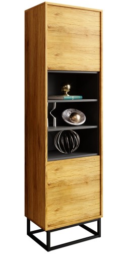 Oryginalna witryna w stylu loftowym, której konstrukcja wykonana jest z wysokiej jakości płyty laminowanej o grubości 15 mm gwarantującej wytrzymałość. Mebel posiada dwoje drzwi oraz otwartą wnękę z półkami wykończoną w kolorze czarnym. Drzwiczki otwierają się przy wykorzystaniu systemu push to open. Cały mebel posadowiony został na metalowej ramie w kolorze czarnym, co zdecydowanie nadaje mu niebywałego charakteru. Oryginalny design mebla sprawia, że zachwyci on niemal każdego gościa Twojego domu.