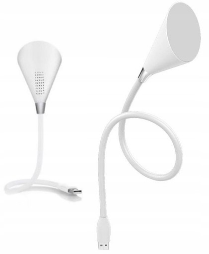 Giętka lampka silikonowa z plastikowym kloszem. Lampka posiada głośnik łączy się z przez Bluetooth oraz dwa kolory świecenia. Lampka wyposażona jest w 5 diod LED Poprzez dotknięcie zmienisz kolor świecenia z białego zimnego na biały zimny.