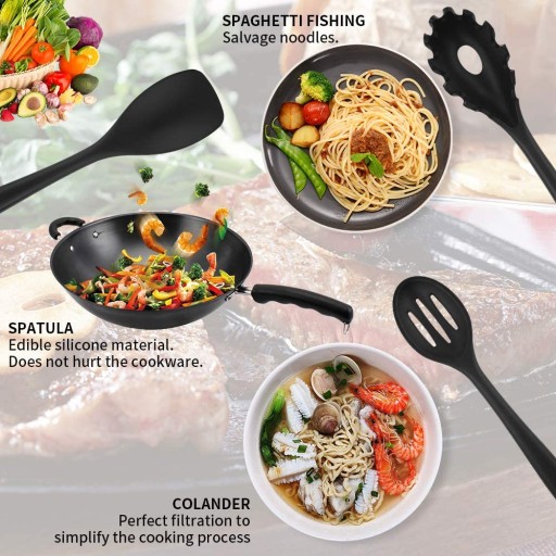 Viesap Zestaw przyborów kuchennych, silikonowe naczynia do gotowania, przybory kuchenne, nieprzywierające, odporne na wysokie temperatury urządzenia kuchenne, trzepaczka, łopatka, szczypce do grilla itp. 11 szt., kolor czarny.