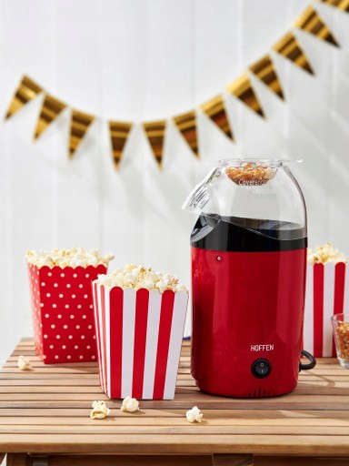 Urządzenie do popcornu marki Hoff en to świetny gadżet nie tylko dla miłośników kina. Dzięki niemu uszykujesz pyszną przekąskę, która wypełni smakiem rodzinne seanse filmowe lub spotkania ze znajomymi. Dzięki technologii obiegu gorącego powietrza szybko przygotujesz lekki popcorn bez tłuszczu. Jeśli jednak masz ochotę, możesz wzbogacić smak popcornu masłem. Możesz je roztopić na dołączonej do zestawu łyżce z miarką, którą wcześniej odmierzysz odpowiednią ilość ziaren. Udanej zabawy i smacznego!
