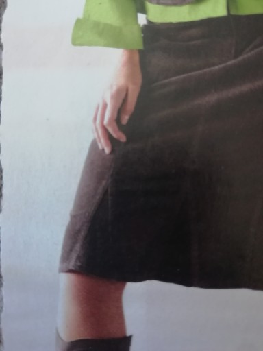 3. Spódnica na pasku, zamykana z przodu na guzik i zamek. Dół spódnicy rozszerzany małymi klinami, bez podszewki. Długość do kolan.