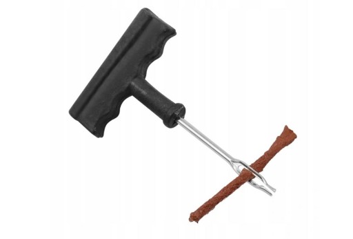 Dwa końce sznura powinny odstawać ok. 0,5 – 1cm ponad bieżnik opony. Zdecydowanym ruchem wyjmij szydło z opony (nie powinno się kręcić szydłem wewnątrz opony podczas jego wyciągania – może to spowodować jego złamanie).