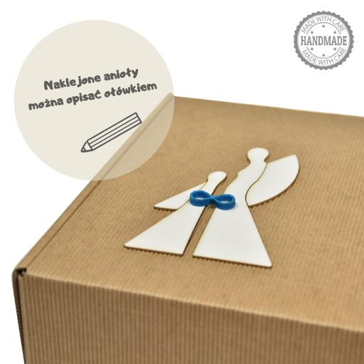 - Ozdobne karbowane pudełko wypełnione wełną drzewną z naklejonymi emblematami postaci tych samych aniołów, które są w zestawie oraz filcowym znakiem nieskończoności.