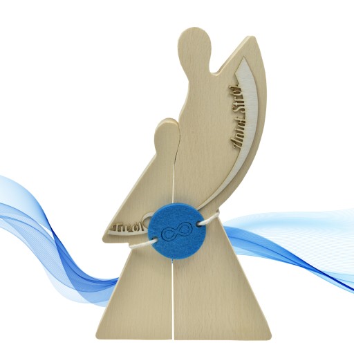 - Dwa Anioły wysokość 25 cm, grubość 2,5 cm. Anioły wykonane są z drewna bukowego, związane sznureczkiem z emblematem filcowym w kształcie koła z wypalonym znakiem nieskończoności. Anioły ozdobione są dodatkowo emblematem wykonanym z beermaty z napisem: