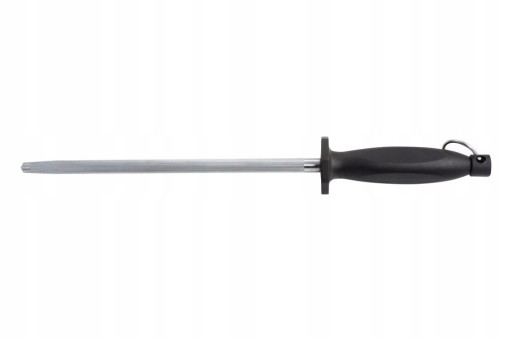 Wysokiej jakości ostrzarka wykonana jest z materiału 19421 z twardym chromowanym wykończeniem dla poprawienia właściwości stali, bezpiecznego plastikowego uchwytu i pierścienia do zawieszenia. Ostrzarka nadaje się do szlifowania noży kuchennych i masarskich.