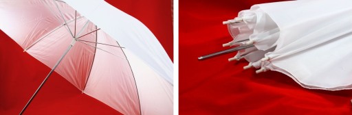 Parasolka wykonana jest ze specjalnego, wielowarstwowego materiału, który bardzo dobrze odbija światło. Na zewnątrz parasolka posiada kolor biały, co sprawia, iż światło rozchodzące się z drugiej strony jest zmiękczane i rewelacyjnie rozchodzi się po dużej powierzchni gwarantując dobre oświetlenie. Zwykłe parasolki srebrne bez specjalnej powłoki, nie powodują efektu rozproszenia, przez co efekt końcowy jest dużo słabszy.