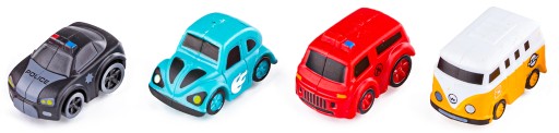 - Autka w kolorze: czarnym, niebieskim, czerwonym oraz biało-żółtym