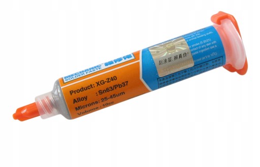 Przedmiotem sprzedaży jest pasta lutownicza MECHANIC XG-Z40 Sn63/Pb37 (z zawartością ołowiu) "płynna cyna", stosowana do lutowania małych i trudno dostępnych elementów SMD oraz wymiany kulek na układach BGA.