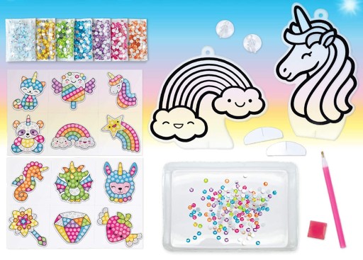 Kreatywny zestaw do tworzenia pięknych bajecznie kolorowych ozdób! Zestaw pozwala na wykonanie mieniących się w słońcu ozdób na okno, biurko, zeszyt lub plecak.