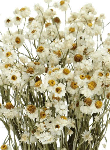 Złociszek oskrzydlony (Ammobium alatum) z polskiej uprawy. Często spotykana jest także nazwa wiekuistka. Suszony bukiet złociszka składa się z niewielkich, białych kwiatów, które prezentują się niezwykle uroczo. Doskonale wpisuje się w klimat wnętrz i przyjęć rustykalnych oraz boho. Często używany jest także przy tworzeniu dekoracji i wianków na ślub, komunię czy baby shower.