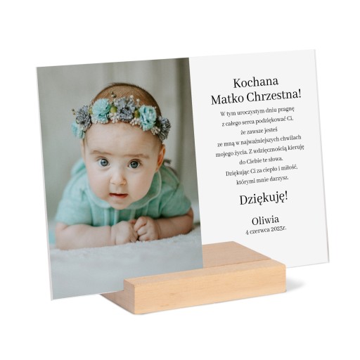 Na tabliczce ze stojakiem w kolorze naturalnego drewna możesz umieścić własne zdjęcie oraz tekst. Wysokiej jakości druk UV na szkle akrylowym jest odporny na warunki atmosferyczne. Ramka, dzięki laserowemu cięciu posiada idealnie gładkie krawędzie.