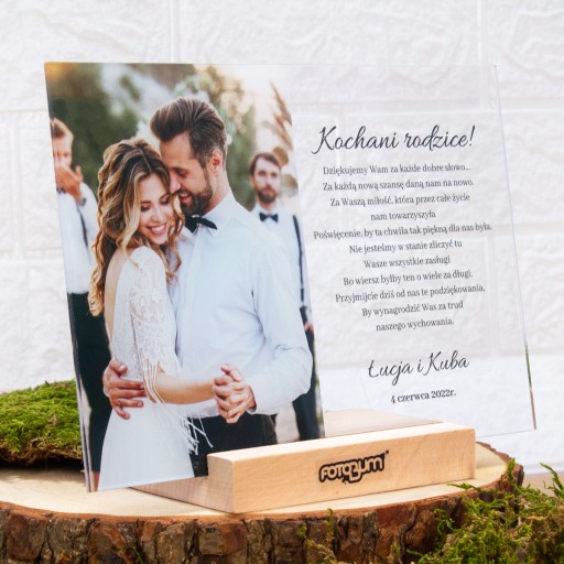 - płytę z pleksi o grubości 3 mm o wymiarze A5 (210 x 150 mm) z nadrukiem dowolnego zdjęcia oraz tekstu