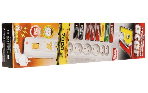 Listwa zasilająco-filtrująca z zabezpieczeniem przeciwprzepieciowym siedmiu urządzeń (5 gniazd z bolcami uziemiającymi oraz 2 gniazdka płaskie). Posiada system ochrony przeciwpożarowej oraz system porządkowania przewodów.