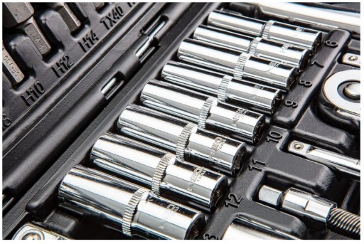 ✅ Nasadki, grzechotki i klucze zostały wykonane z najwyżej jakości stali chromowo-wanadowej (CrV), która zapewnia długoletnią wytrzymałość narzędzi. Końcówki narzędziowe zostały wykonane ze stali narzędziowej S2.