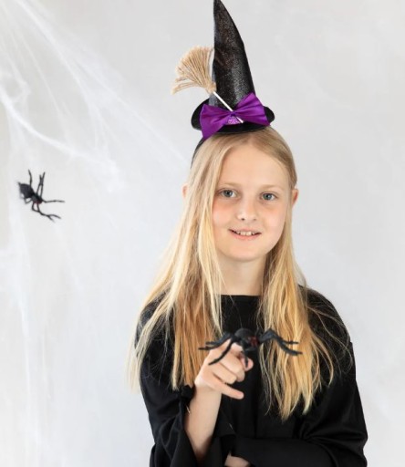 Opaska z czarnym, brokatowym kapeluszem czarownicy, fioletową kokardką i małą miotełką. Super dodatek do stroju na Halloween.
