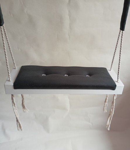 Oferujemy Państwu nową malowaną na biało huśtawkę siedzisko na piance o grubości 3cm. Huśtawka wykonana jest z drewna malowanego na biało oraz z mięciutkiego siedziska wykończonego materiałem pluszowym. Huśtawkę wykonujemy samodzielnie. Jest to produkt polski.