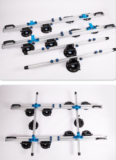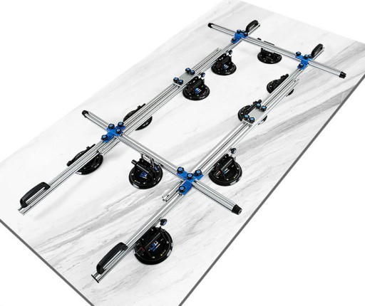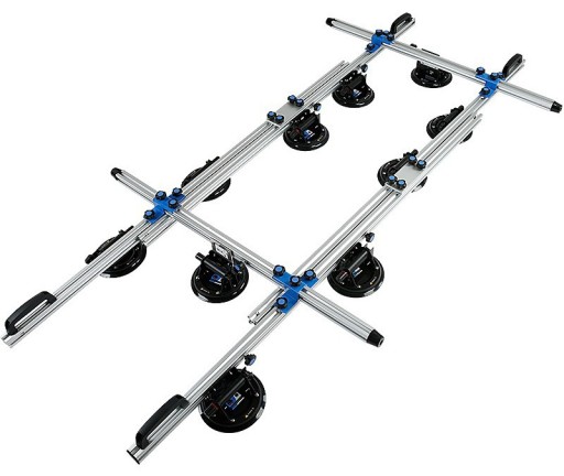 PROFI Trans Unlimited P00704 to system aż dziesięciu przyssawek próżniowych zamocowanych na sześciu profilach aluminiowych za pomocą regulowanych uchwytów. Dzięki takiemu rozwiązaniu przenoszenie dużych, wiotkich formatów płytek czy szkła staje się wielokrotnie bezpieczniejsze poprzez usztywnienie transportowanego elementu.