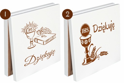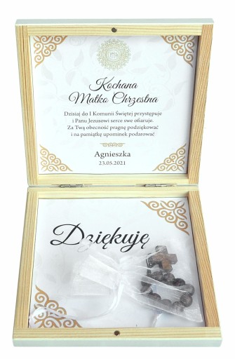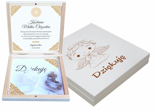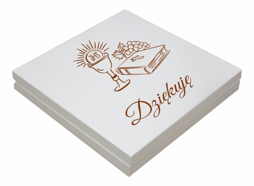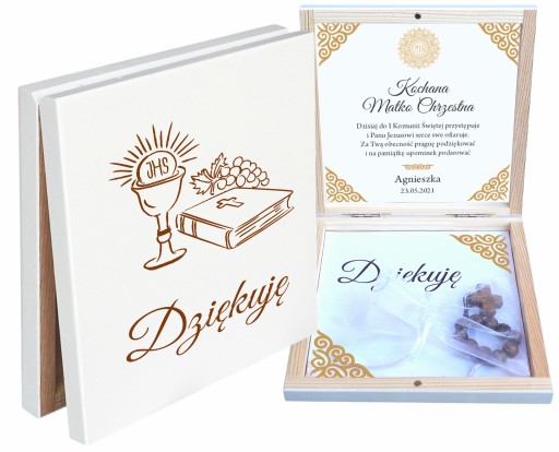 Pudełko wykonane jest z naturalnego drewna, dwukrotnie pomalowane na biało. Razem z naniesionym grawerem wygląda wspaniale. Dodatkowo ozdobny papier podkreśla imponujący wygląd. Pudełko ozdobione jest dwoma karteczkami z uroczym podziękowaniem, imieniem dziecka oraz datą Pierwszej Komunii Świętej lub Chrztu.