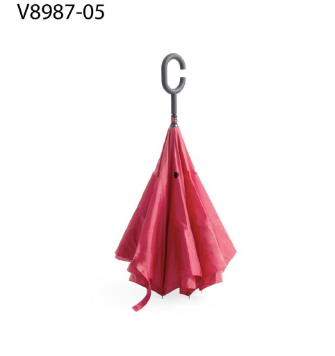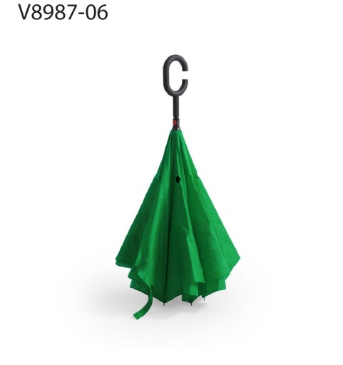 Odwracalny parasol manualny, 8 paneli, specjalna rączka w kształcie litery C ułatwiająca obsługę telefonów w czasie deszczu.