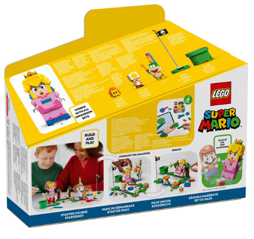 Czas na przygody z Peach — daj fanom gry Super Mario™ nową okazję na przeniesienie się do świata LEGO® Super Mario™ za sprawą tego zestawu startowego (71403) z figurką LEGO® Peach™. Interaktywna figurka LEGO® Peach™ — ma czujnik kolorów, ekran LCD, na którym natychmiast pokazuje różne reakcje na ruch, oraz głośnik, który odtwarza kultowe odgłosy i muzykę z gier wideo. Zabawa w zbieranie cyfrowych monet — zestaw zawiera rurę startową, słupek końcowy, huśtawkę, figurkę Lava Bubble do wystrzelenia, latający pytajnikowy blok oraz figurki Lemmy’ego i Yellow Toada. Owocowa zabawa — LEGO® Peach™ reaguje w radosny sposób na czerwony owoc, który można też podarować Yellow Toadowi lub innej interaktywnej figurce (brak w zestawie). „Zjedz” owoc, aby zdobyć cyfrowe monety.